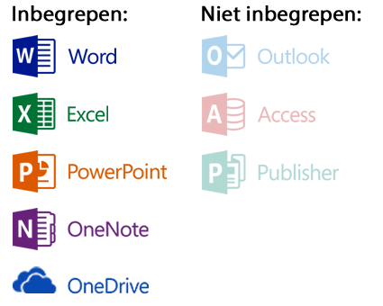 • Inbegrepen: Word, Excel, Powerpoint, OneNote, OneDrive
