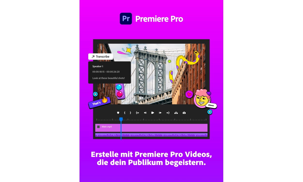 Bearbeiten und schneiden Sie Filme in Premiere Pro. Fügen Sie Filme zusammen, unterteilen Sie sie in Kapitel, passen Sie Farben an, fügen Sie Untertitel, Musik oder andere Sounds hinzu und exportieren Sie sie für YouTube. Nicht schwierig, nur schön!
