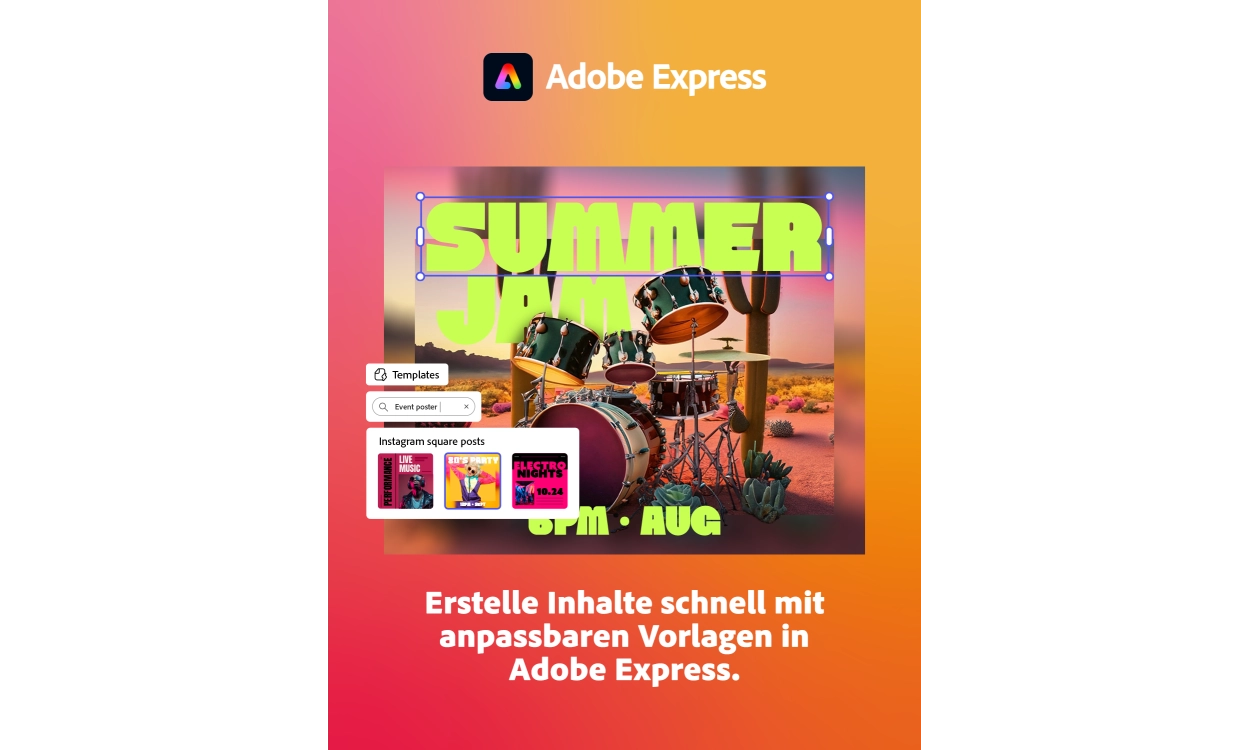 Adobe Express Premium ist die kreatieve All-in-One-App mit neuen generativen KI-Funktionen, mit denen du schnell und einfach ansprechende Social-Media-Beiträge, Videos, Bilder, PDFs, Flyer, Logos und vielen mehr entwerfen und teilen kannst.