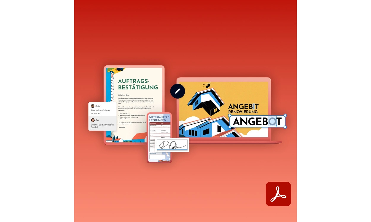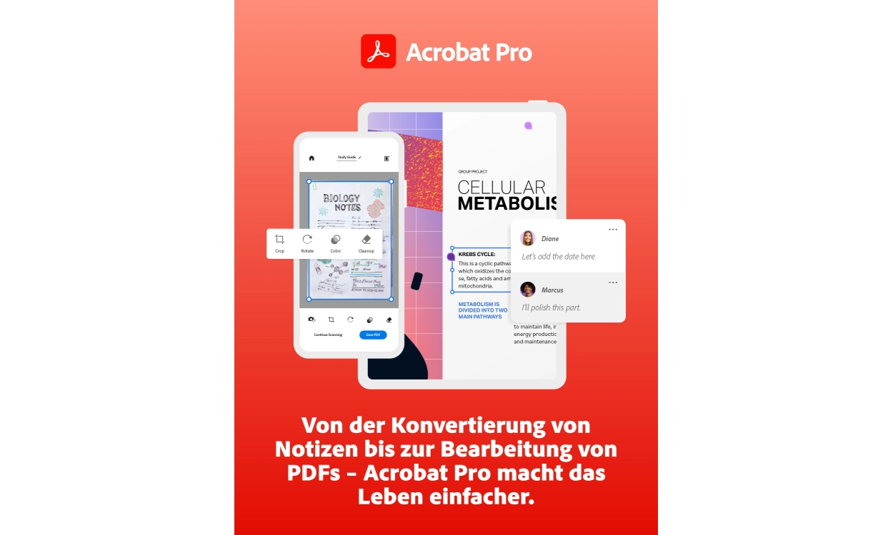 Acrobat Pro ist die professionelle Version des kostenlosen Programms Adobe Acrobat Reader. Acrobat Pro hat viel mehr Funktionen. Sie können PDFs bearbeiten, Dateien zusammenführen, Kommentare hinzufügen, Dokumente digital signieren, Scans in bearbeitbaren Text umwandeln und sie mit anderen teilen. Und das ist nur eine winzige Auswahl der vielen Möglichkeiten.