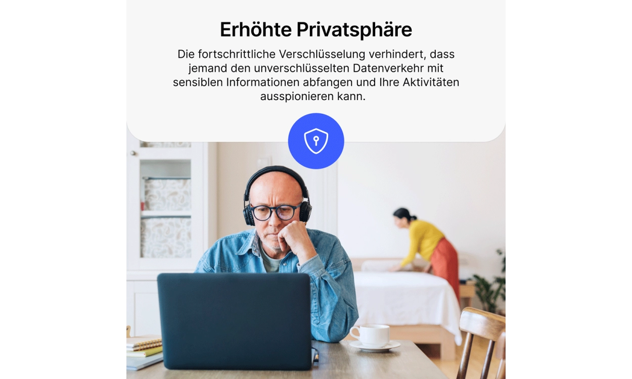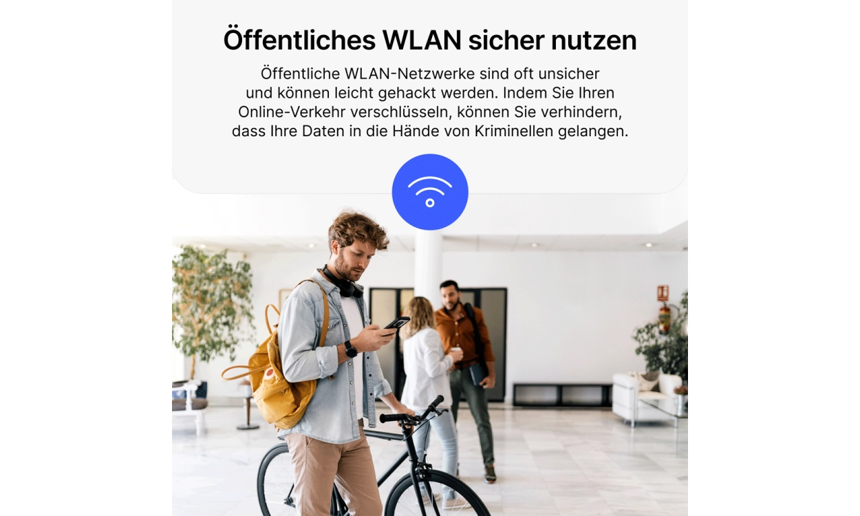 - Schütze deine Verbindung im WLAN: Öffentliche WLAN-Netzwerke können gefährlich sein, aber NordVPN Basis verschlüsselt deinen Internetverkehr, selbst in unsicheren Netzwerken in Cafés oder Flughäfen, sodass du vor Hackern geschützt bleibst.