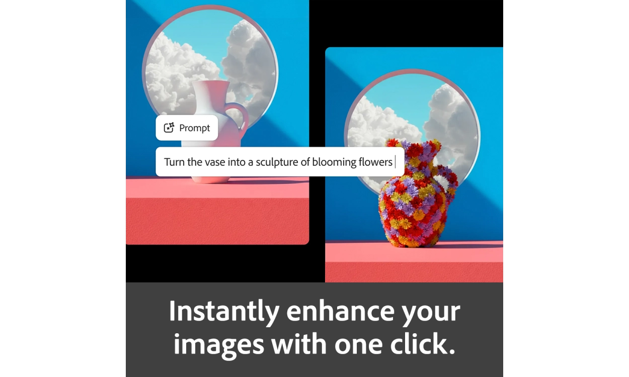 With features such as Generative Fill, you can easily add new elements or remove parts of an image. You describe what you want to change, and the software processes it instantly. This allows you to achieve usable results quickly, even without extensive design knowledge.