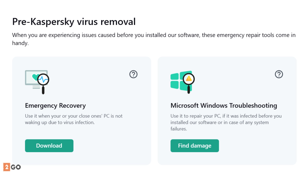 Microsoft Windows Troubleshooting: removes pre-existing malware on your Windows device, from before you installed the protection. Also fixes problems with your Internet connection if necessary. Emergency Recovery: with Kaspersky Rescue Disk on a usb stick, you can restore the operating system and data. Application Vulnerability Scanning: the apps already installed on your devices are scanned for vulnerabilities to eliminate infections. Rootkit Scan: checks for malware that is so deeply integrated into your device that it starts malware even before your operating system has started.