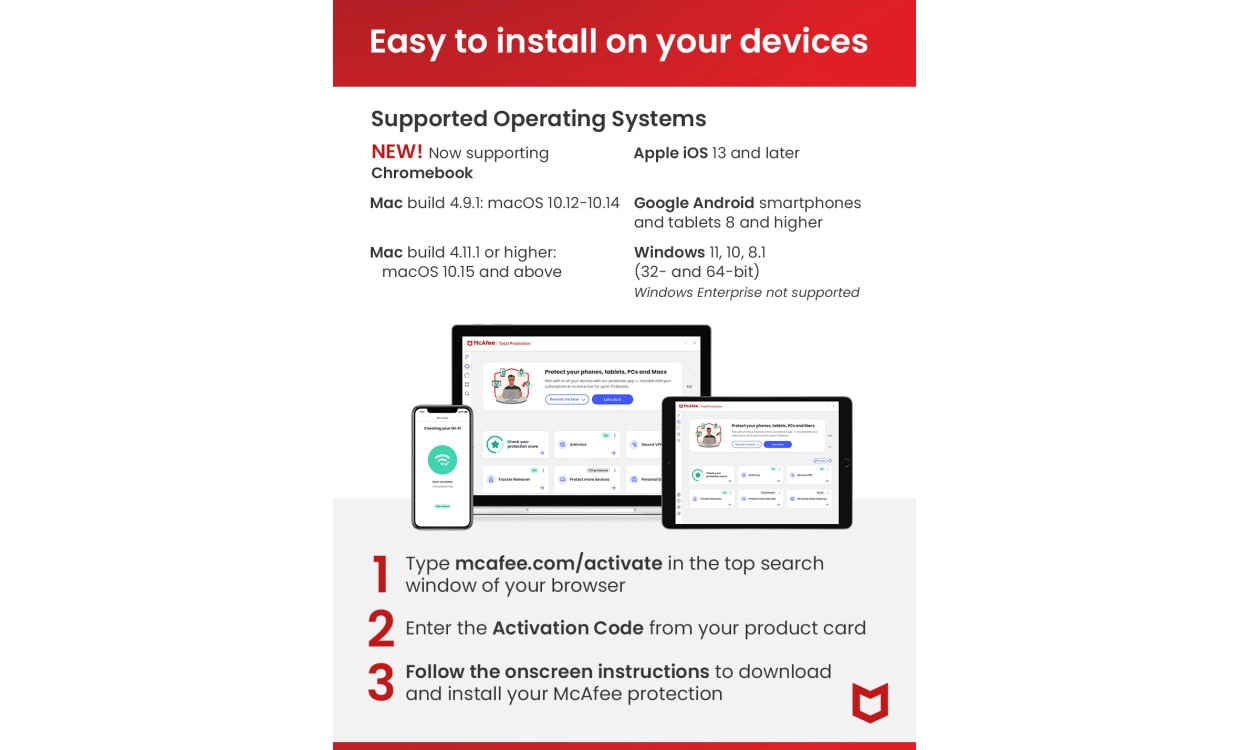 Protect your Windows PC from threats like malware, virusses, and other unwanted software. On smartphones and tablets, McAfee offers data protection with anti-theft features. The software also gives shields WiFi to prevent malicious software before it even enters your device. Identity protection ensures your personal information is stored encrypted and provides fast signing in to websites without having to worry about security. On top of that, McAfee Total Protection has the ability to encrypt files on your non-mobile devices.