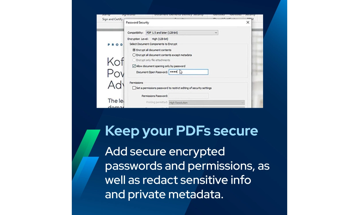 • Verbeterde beveiliging: Beveilig je documenten met AES-versleuteling tot 256-bit en maak gebruik van Microsoft Information Protection Services om ervoor te zorgen dat je bestanden veilig zijn tegen ongeoorloofde toegang. Tools voor redactie en metadata-verwijdering zorgen bovendien voor vertrouwelijkheid van gevoelige documenten.