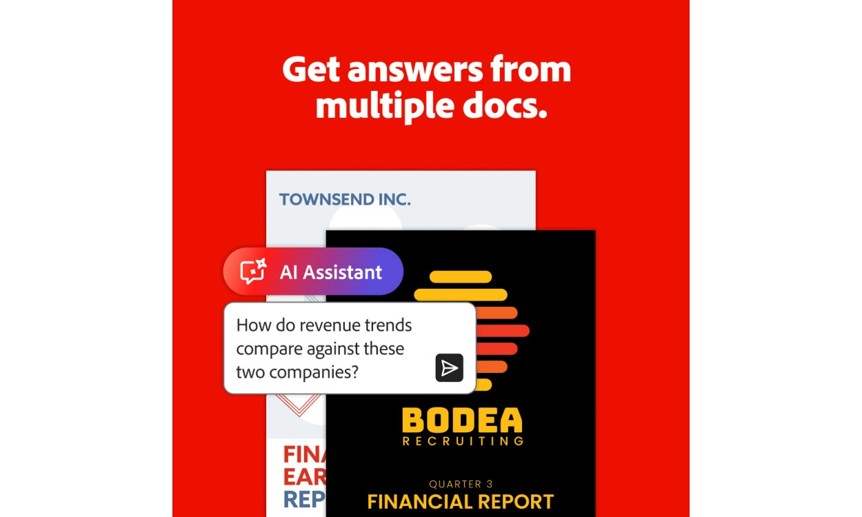 Met Adobe Acrobat Standard kun je eenvoudig PDF’s maken, bewerken en beheren op zowel pc als Mac. De toevoeging van Adobe AI Assistant voor Acrobat helpt je sneller en slimmer te werken met AI-gestuurde samenvattingen en stel je vragen over het document aan AI en ontvang direct een antwoord?