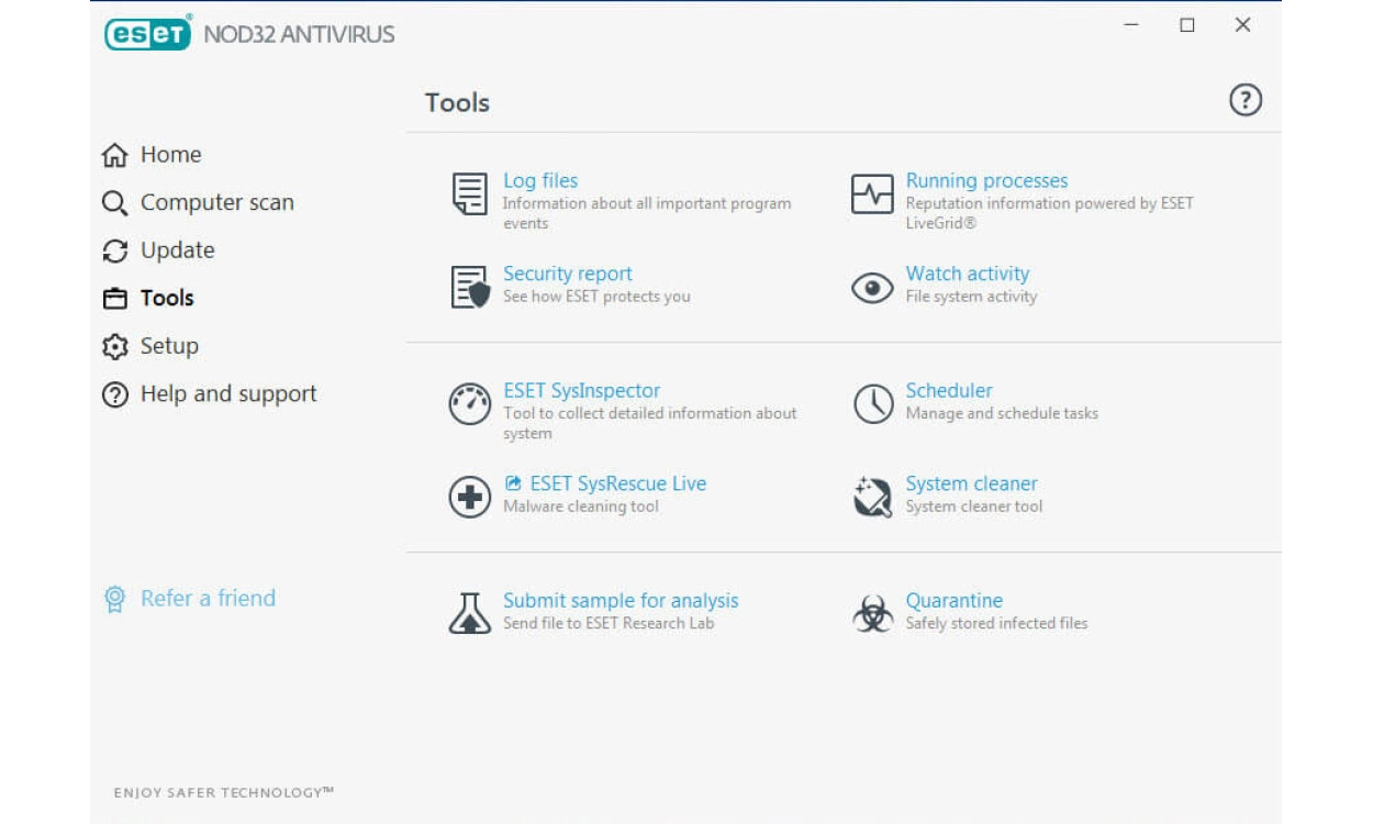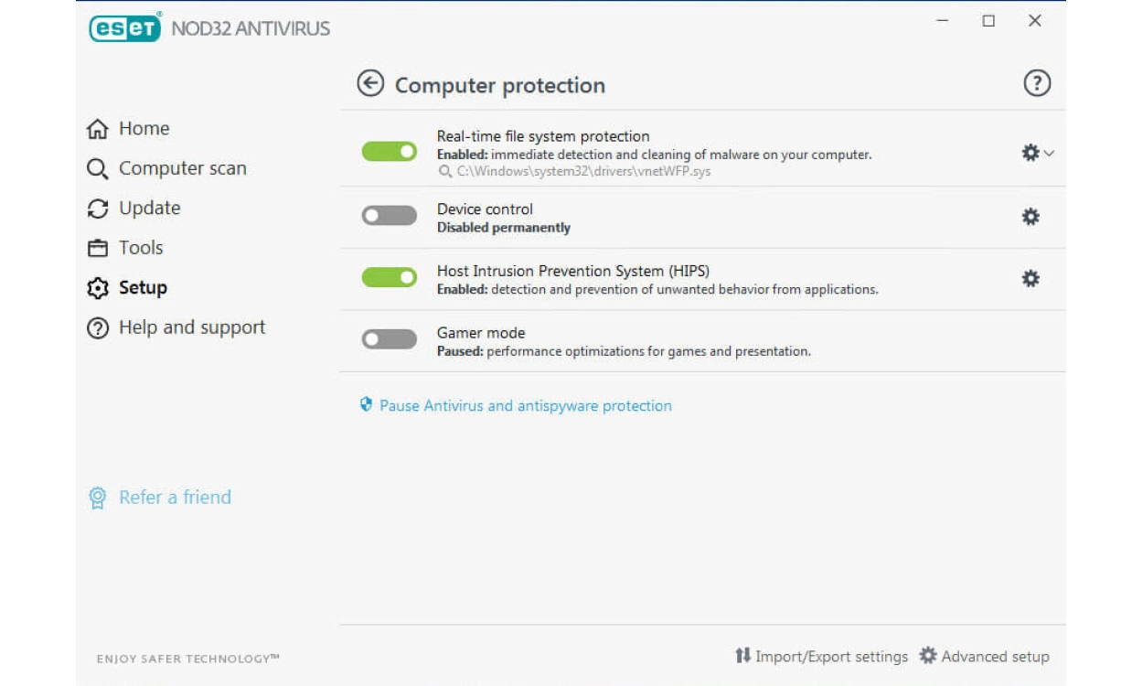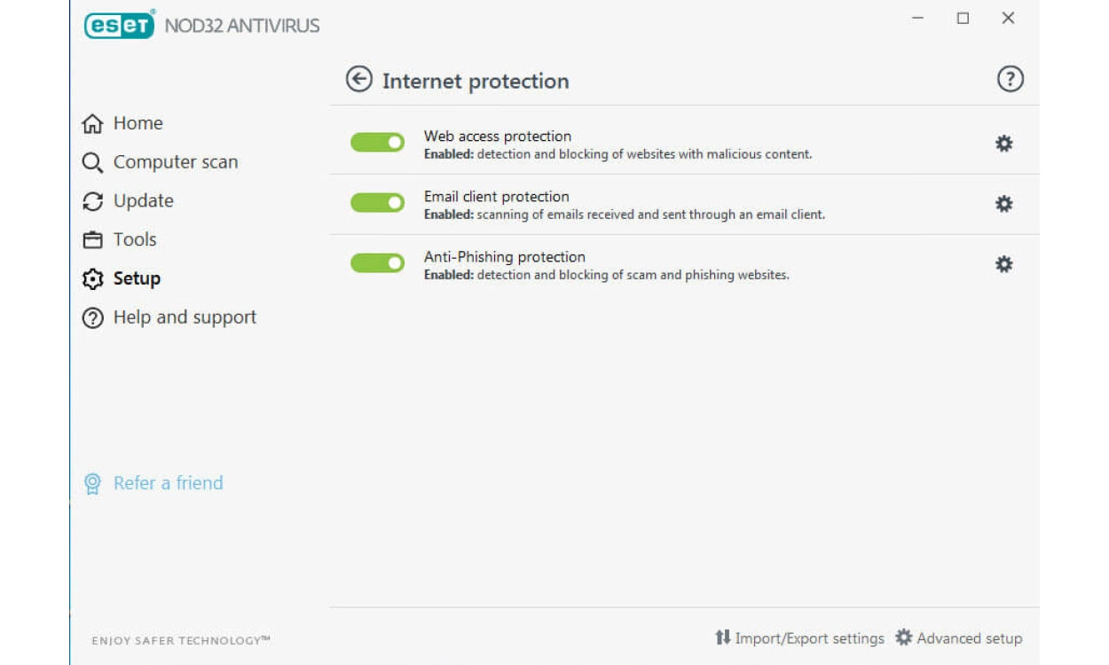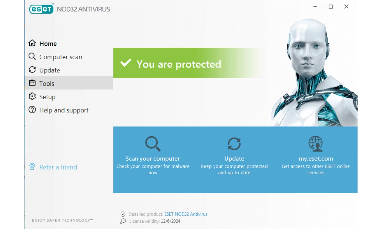 Na installatie ben je met de standaardinstellingen uitstekend beschermd. Daarna houdt ESET NOD32 Antivirus je op de hoogte van mogelijke bedreigingen en beveiligingsproblemen, zodat je direct actie kunt ondernemen vanuit het hoofdscherm. De gebruikersinterface is zo ontworpen dat je taken gemakkelijk uit kunt voeren. Daarnaast is het met 150 gedetailleerde instellingen mogelijk de software volledig naar eigen wens te configureren.